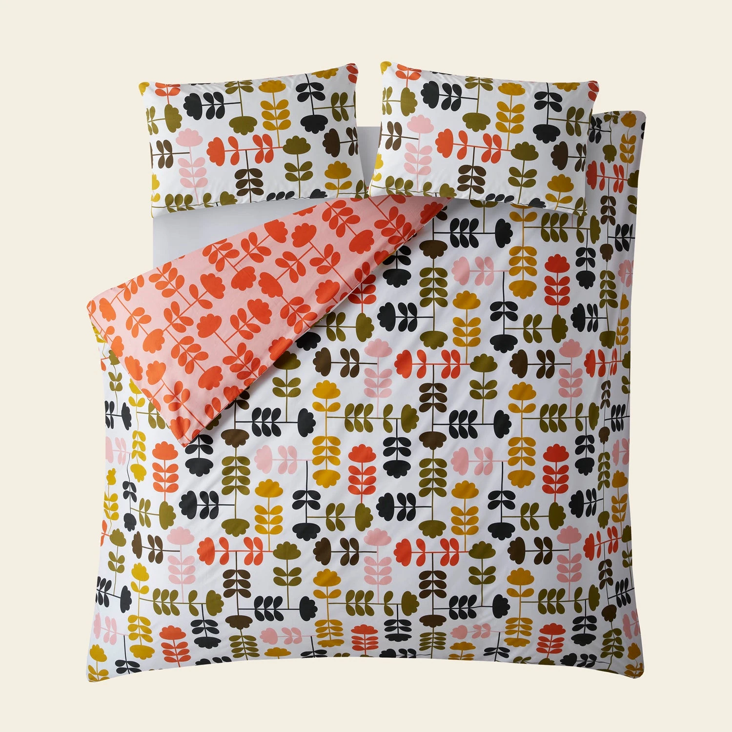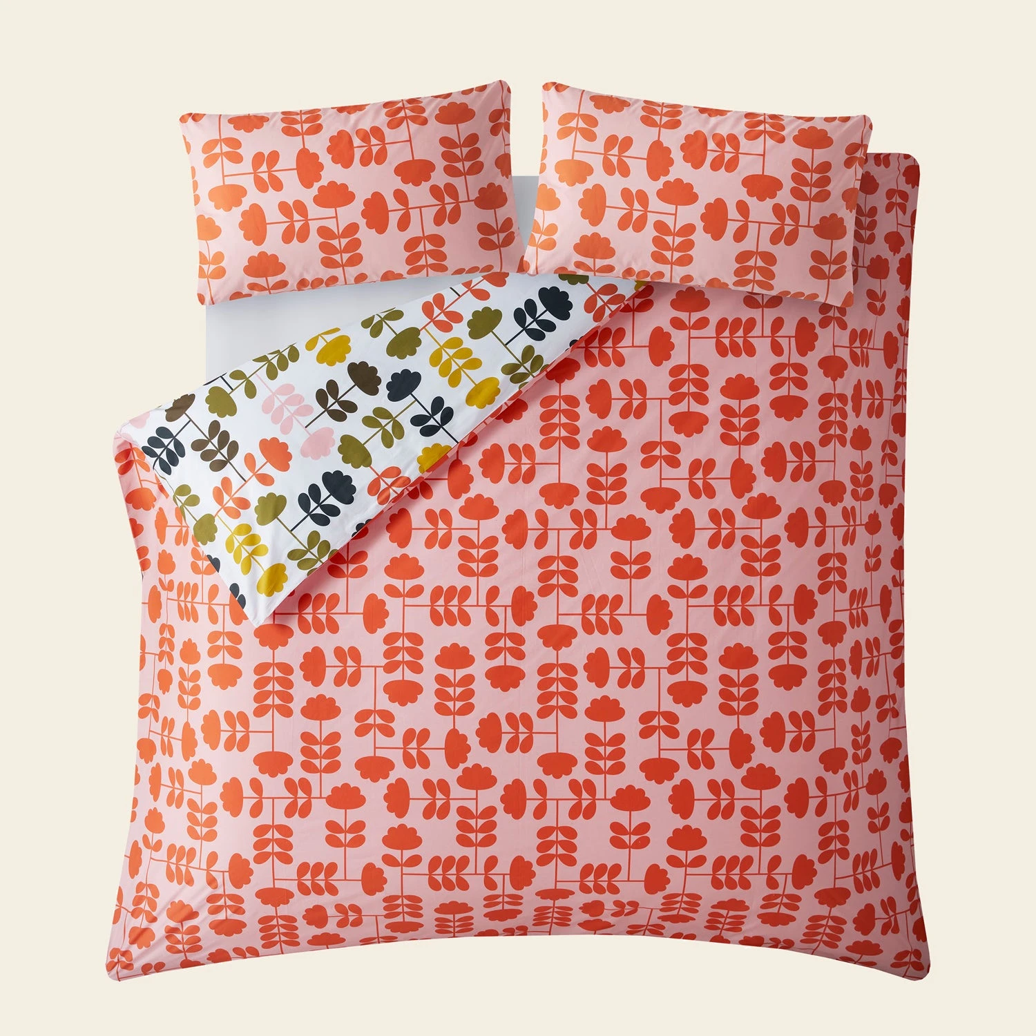 The Cut Stem print incorporates Orla Kiely’s iconic stem design with florals to create a bold, fun design that makes a statement. A versatile piece, the background colour is flipped on each side, so the choice is yours – warm paprika and pink tones, or a playful off-white background with multi-coloured florals. Made from 100% cotton, this luxurious bed linen set has a 200-thread count.