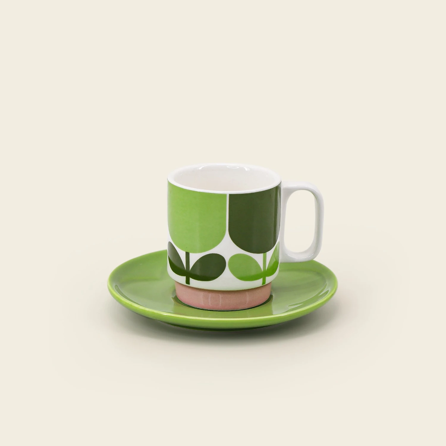 Our espresso cup and saucer set is printed in our Block Flower print in contrasting greens and pinks. The perfect pair!