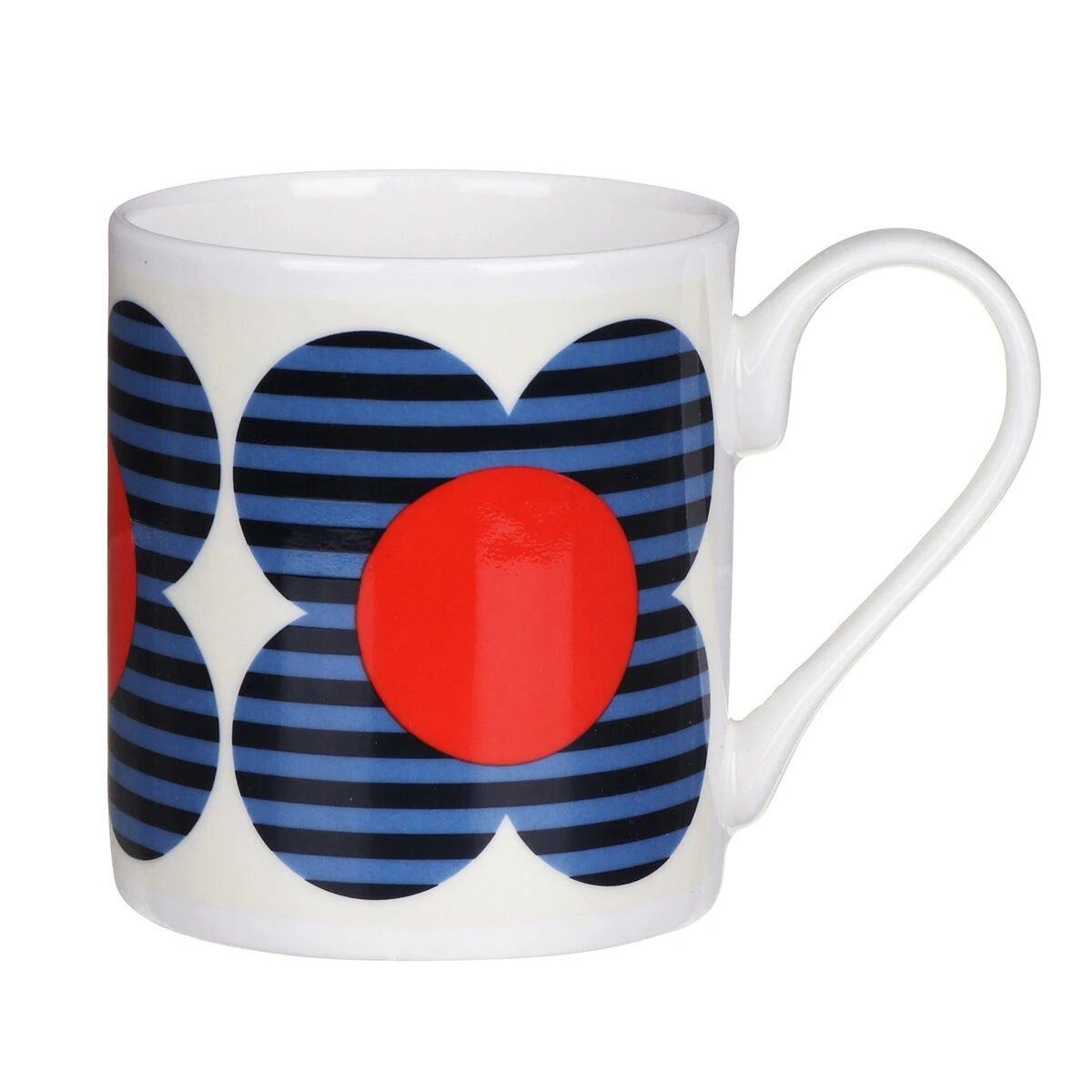 This fabulous mug features the ‘Striped Flower’ design by Orla Kiely; a four-petal flower decorated with a horizontal striped pattern in blue and navy, and the centre of the flower is a large red circle. This beautiful retro inspired flower repeats around the body of the mug three times and is set against a cream background allowing the pattern to stand out. Add a retro vibe to your kitchen with the simple design of this standard size mug that will fit into any scheme and particularly suits a modern kitchen!